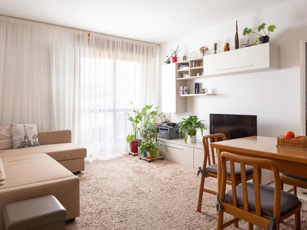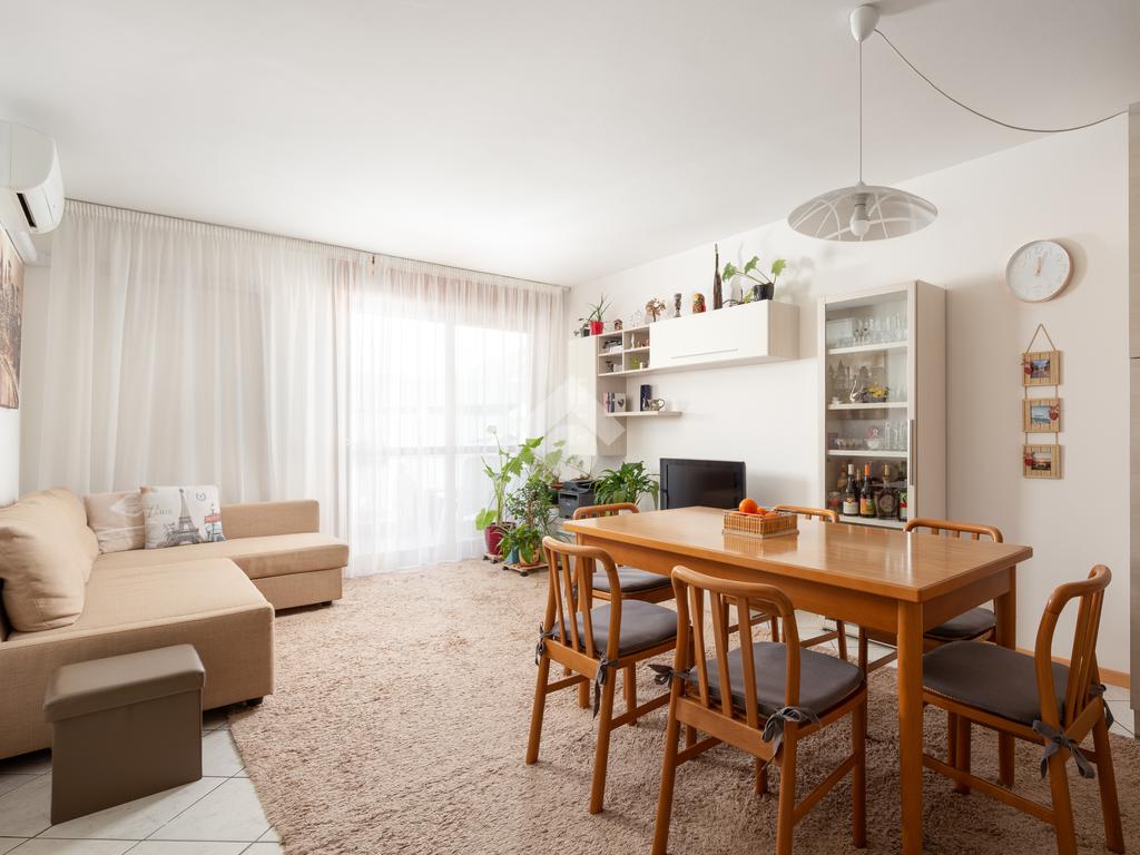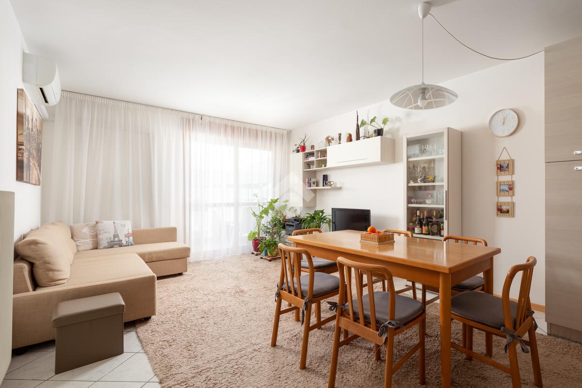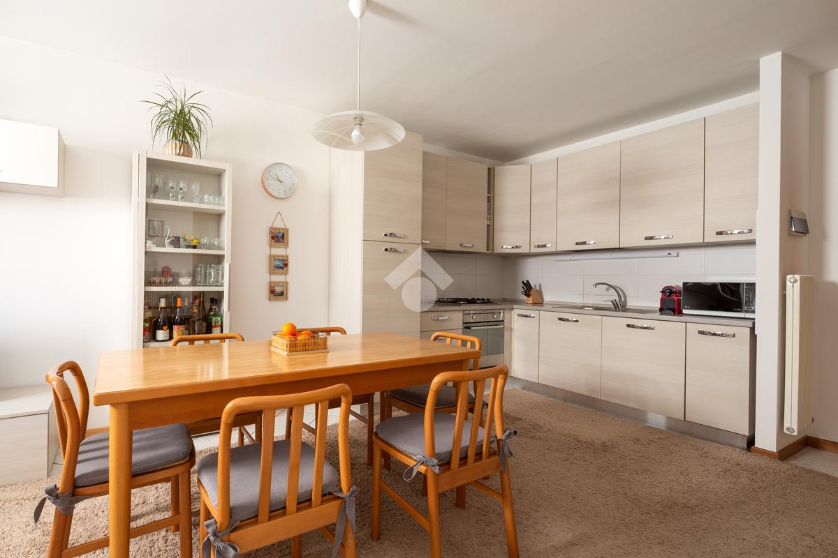L'ingresso dell'abitazione si sviluppa su un accogliente open space caratterizzato da un moderno e pratico angolo cottura e una zona living con accesso al balcone.